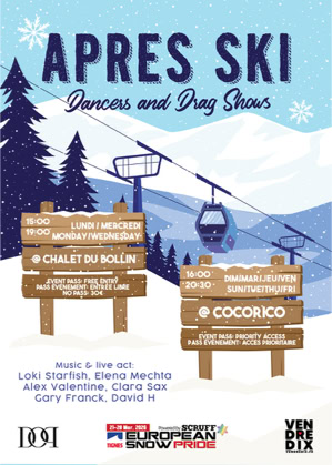 European Snow Pride has daily partieswith different themes featuring the best artists and most fabulous performers.